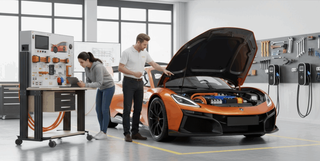 Von der Ladestation bis zum Fahrzeug: Unsere Trainingssysteme machen Elektromobilität erlebbar. Komplettlösungen für Werkstätten, Berufsschulen und Trainingszentren zeigen, wie Zukunftstechnologien funktionieren – und wie sie vermittelt werden.