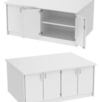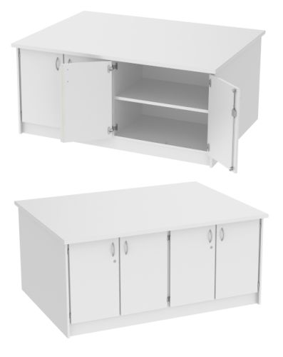 4er-Schrankinsel als kombinierter Aufbewahrungs- und Arbeitsbereich in technischen Werkstätten und Laboren. Die Insel besteht aus einem 4er-Block Beistellschränken, der wiederum aus 2×2 Nutmatten-Schränken gebildet wird. Die Einzelschränke sind 2-türig mit jeweils 2 Aufbewahrungsfächern (oben + unten) pro Seite = 4 Fächer je Schrank, getrennt durch einen Mittelsteg. Eine obere Abdeckplatte im Maß 1760x1300x30mm bildet eine große Arbeitsfläche. Zusätzlich sind beide Seiten mit einer vollflächigen Abschlussblende versehen. Alle Korpusteile sind aus 19mm starker hochverdichteter mehrschichtiger Feinspanplatte mit beidseitiger Kunststoffbeschichtung auf Melaminharzbasis der Güteklasse E1, Farbe hellgrau RAL7035 Je Schrankseite 2 Fächer (1 Einlegeboden) mittig zur Aufnahme von technischen Geräten. Alle Vorderkanten als massive Schutzkanten aus 3mm dickem durchgefärbten Kunststoff, Farbe grau RAL7047 Die Rückwand besteht aus einer eingenuteten 10mm dicken kunststoffbeschichteten Dreischichten-Qualitätsspanplatte nach DIN EN 14322. Alle Türen sind mit einstellbaren Winkelbändern angeschlagen, inkl. Dreipunktverriegelung, Wechselzylinderschloss und Edelstahlgriff (schließanlagenfähigen Sicherheitsschlössern), Öffnungswinkel 250° Die Außenflächen sind durch eine spezielle Kristall-Strukturierung kratzunempfindlich und abriebfest Gesamtabmessungen der Lerninsel: 1760x1300x800mm (B x H x T)