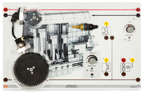 Die Moduleinheit „Antriebseinheit mit Kurbel-. Nocken- und Motortemperatursensor“ ist Bestandteil des Trainingssystems „Modulares Motormanagement“. Durch die Symbiose von realen Komponenten sowie digital erstellten Grafiken wird der maximal mögliche Wissenstransfer des einzelnen Moduls voll ausgeschöpft. Der Auszubildende lernt einerseits das reale Aussehen sowie die reale Haptik des Bauteils kennen, andererseits kann er dieses reale Aussehen direkt mit dem dazugehörigen Schaltsymbol verknüpfen, was ihn maßgeblich beim Lesen und Verstehen von Schaltplänen unterstützt. Je nach Modul existiert neben dem Schaltsymbol ebenfalls noch eine 3D-Zeichnung, die die jeweilige Komponente im Detail zeigt. Da die 4mm-Sicherheitsbuchsen des Moduls dieselbe Farbkodierung wie das Steuergerät besitzen, ist einerseits die grundlegende Funktion des jeweiligen Anschlusses selbsterklärend, andererseits wird die Gefahr einer fehlerhaften Verkabelung minimiert. Für den Fall einer falschen Verkabelung besitzen alle Sensor- und Aktor-Module eine inhärente Sicherheitsbeschaltung, die sie gegen Kurzschlüsse absichert. Technische Highlights: Realer Kurbelwellensensor Realer Nockenwellensensor Realer Motortemperaturgeber Schaltsymbol mit Messpunkten Kurzschlussfest Schalter für Real- und Simulationsbetrieb der Motortemperatur Stufenlose Simulation der Temperatur in einem Rahmen von -20 bis 110 °C. Schalter für Real- und Simulationsbetrieb der Kurbel- bzw. Nockenwelle Stufenlose Simulation der der Drehzahl oder reale Ansteuerung über den Pedalwertgeber. Hochauflösender Druck eines R4-Motors im Schnitt Technische Details: Betriebsspannung: 5 V ?Abmessungen: 297 x 445 x 180 mm (HxBxT) Gewicht: 3,4 kg