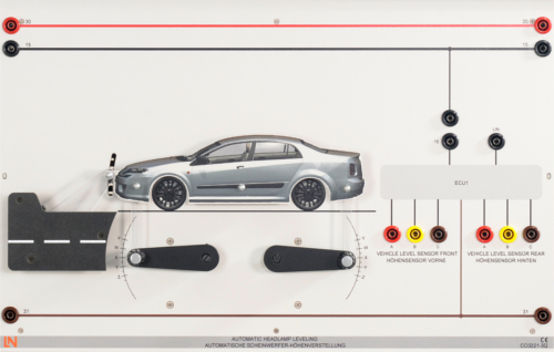 Mit diesem Modul kann die automatische Scheinwerferhöhenverstellung der Xenon-Scheinwerfer (CO3221-3M/3N) aktiviert bzw. gesteuert werden. Über das Model des Fahrzeugs kann das momentane Niveau des Fahrzeugs verändert werden, wodurch eine direkte Reaktion der Stellmotoren in den Scheinwerfern hervorgerufen werden kann. Alle Anschluss- bzw. Messpunkte auf diesem Modul sind als 4mm-Sicherheitsmessbuchsen ausgeführt. Darüber hinaus verfügt das Modul über ein LIN-Interface, über das die Kommunikation mit den Stellmotoren der Frontscheinwerfer hergestellt wird.
