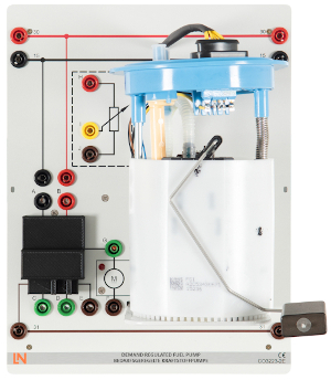 Die Moduleinheit „Bedarfsgeregelte Kraftstoffpumpe“ ist Bestandteil des Trainingssystems „Modulares Motormanagement“. Durch die Symbiose von realen Komponenten sowie digital erstellten Grafiken wird der maximal mögliche Wissenstransfer des einzelnen Moduls voll ausgeschöpft. Der Auszubildende lernt einerseits das reale Aussehen sowie die reale Haptik des Bauteils kennen, andererseits kann er dieses reale Aussehen direkt mit dem dazugehörigen Schaltsymbol verknüpfen, was ihn maßgeblich beim Lesen und Verstehen von Schaltplänen unterstützt. Je nach Modul existiert neben dem Schaltsymbol ebenfalls noch eine 3D-Zeichnung, die die jeweilige Komponente im Detail zeigt. Da die 4mm-Sicherheitsbuchsen des Moduls dieselbe Farbkodierung wie das Steuergerät besitzen, ist einerseits die grundlegende Funktion des jeweiligen Anschlusses selbsterklärend, andererseits wird die Gefahr einer fehlerhaften Verkabelung minimiert. Für den Fall einer falschen Verkabelung besitzen alle Sensor- und Aktor-Module eine inhärente Sicherheitsbeschaltung, die sie gegen Kurzschlüsse absichert.