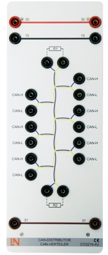 Das Modul „CAN-Verteiler“ ermöglicht Ihnen den einfachen und schnellen Aufbau eines kompletten CAN-Kommunikationsnetzwerks mit bis zu sechs Teilnehmern. Weiterhin besitzt das Modul spezielle Steckplätze für Abschlusswiderstände in 4mm-Ausführung. Somit können über den CAN-Verteiler sowohl Low- als auch High-Speed Signale übertragen werden.