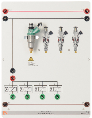 Die Moduleinheit „Einspritzventile“ ist Bestandteil des Trainingssystems „Modulares Motormanagement“. Durch die Symbiose von realen Komponenten sowie digital erstellten Grafiken wird der maximal mögliche Wissenstransfer des einzelnen Moduls voll ausgeschöpft. Der Auszubildende lernt einerseits das reale Aussehen sowie die reale Haptik des Bauteils kennen, andererseits kann er dieses reale Aussehen direkt mit dem dazugehörigen Schaltsymbol verknüpfen, was ihn maßgeblich beim Lesen und Verstehen von Schaltplänen unterstützt. Je nach Modul existiert neben dem Schaltsymbol ebenfalls noch eine 3D-Zeichnung, die die jeweilige Komponente im Detail zeigt. Da die 4mm-Sicherheitsbuchsen des Moduls dieselbe Farbkodierung wie das Steuergerät besitzen, ist einerseits die grundlegende Funktion des jeweiligen Anschlusses selbsterklärend, andererseits wird die Gefahr einer fehlerhaften Verkabelung minimiert. Für den Fall einer falschen Verkabelung besitzen alle Sensor- und Aktor-Module eine inhärente Sicherheitsbeschaltung, die sie gegen Kurzschlüsse absichert.