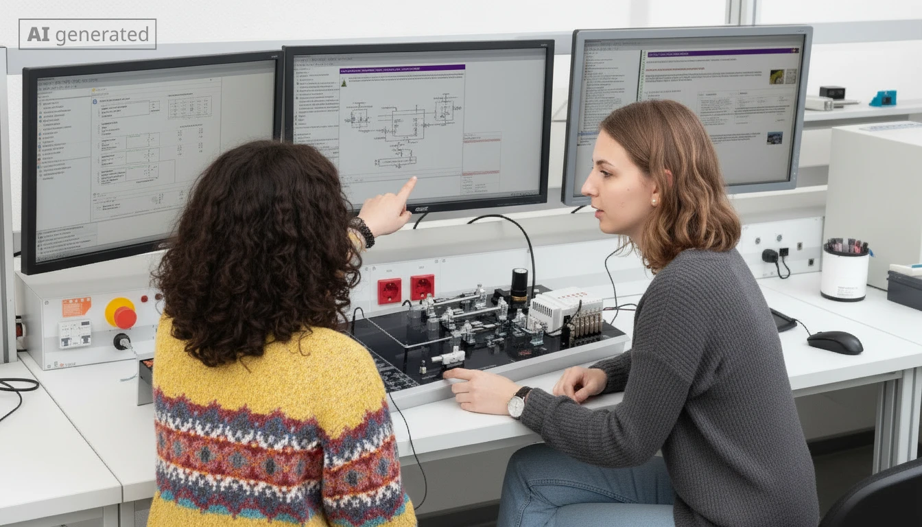 Der begleitende E-Learning-Kurs führt die Lernenden Schritt für Schritt von den Grundlagen bis zu komplexen Ablaufsteuerungen. Durch integrierte Animationen und Theorieblöcke erhöht sich das Verständnis für unsichtbare Vorgänge – wie zum Beispiel Druckaufbau oder Schaltlogik – signifikant.