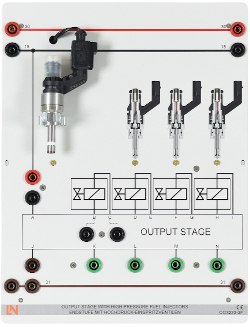 Die Moduleinheit „Endstufe mit Hochdruck-Einspritzventilen“ ist Bestandteil des Trainingssystems „Modulares Motormanagement“. Durch die Symbiose von realen Komponenten sowie digital erstellten Grafiken wird der maximal mögliche Wissenstransfer des einzelnen Moduls voll ausgeschöpft. Der Auszubildende lernt einerseits das reale Aussehen sowie die reale Haptik des Bauteils kennen, andererseits kann er dieses reale Aussehen direkt mit dem dazugehörigen Schaltsymbol verknüpfen, was ihn maßgeblich beim Lesen und Verstehen von Schaltplänen unterstützt. Je nach Modul existiert neben dem Schaltsymbol ebenfalls noch eine 3D-Zeichnung, die die jeweilige Komponente im Detail zeigt. Da die 4mm-Sicherheitsbuchsen des Moduls dieselbe Farbkodierung wie das Steuergerät besitzen, ist einerseits die grundlegende Funktion des jeweiligen Anschlusses selbsterklärend, andererseits wird die Gefahr einer fehlerhaften Verkabelung minimiert. Für den Fall einer falschen Verkabelung besitzen alle Sensor- und Aktor-Module eine inhärente Sicherheitsbeschaltung, die sie gegen Kurzschlüsse absichert.