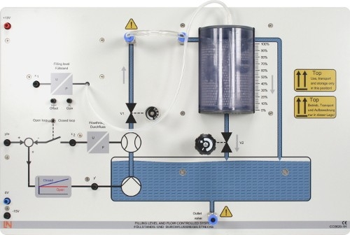 Die Anlage Füllstandbecken ist ein didaktischer und praktischer Versuchsaufbau zur Regelungstechnik. Füllstand und Durchfluss lassen sich beide an einem Gerät untersuchen. Aufgrund der direkt sichtbaren Regelgröße „Flüssigkeitshöhe“ ist die Füllstandregelung ein besonders anschauliches Experiment und damit in besonderem Maße für den Einstieg in die Regelungstechnik geeignet. Das kompakte Ausbildungsgerät enthält das Füllstandbecken, einen Druckmessumformer zur Ermittlung der aktuellen Füllstandhöhe sowie einen Vorratsbehälter inklusive Pumpe. Um eine konstante Förderleistung der Pumpe zu erreichen, ist eine abschaltbare, unterlagerte Regelung mit Durchflussmesser integriert. Störgrößen sind über einstellbare Drosselventile simulierbar, die den Zu- bzw. Ablauf des Füllstandbeckens verändern. unterlagerte Durchflussregelung integrierter Leistungsverstärker Klarsichtbehälter zur Füllhöhenanzeige Störgrößen über einstellbare Drosselventile simulierbar Messstelle für Druckmessfühler im Behälter Druckmessfühler zur Füllhöhenmessung, inklusive Tauchrohr Ausgangsspannung: 0 – 10 V Einstellung für Nullpunkt und Verstärkung zusätzlicher Zwangsüberlauf Flüssigkeitsvorratsbehälter Betriebsspannung: +/-15 V DC Nennstrom: 1,2 A Abmessungen: 297 x 456 x 160 mm (HxBxT) Gewicht: 3,0 kg