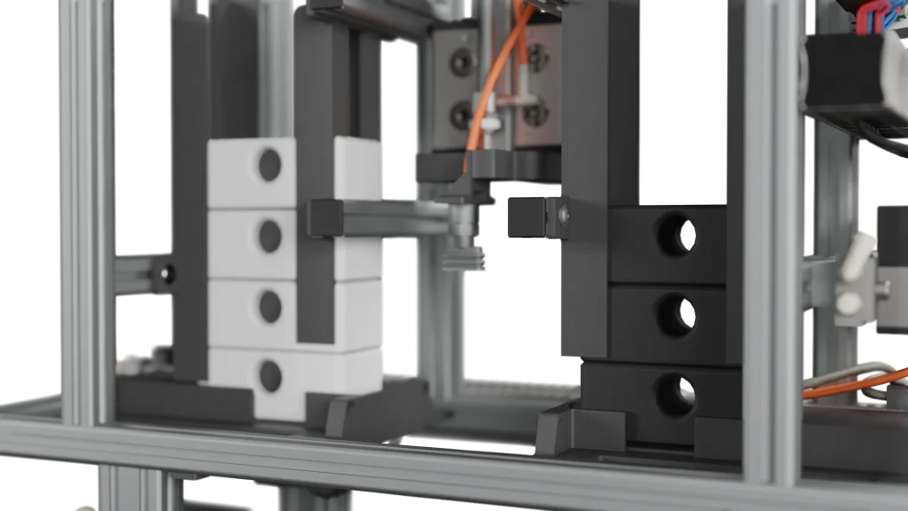Die geführte Montage ist eine realistische Pick-and-Place-Anwendung, die einen industrietypischen Montageprozess simuliert. Pneumatisch angetriebene Schubladen fahren Material aus zwei Magazinen aus, und ein Saug-Greifer platziert die Teile präzise auf einem Werkstückträger. Dieser praxisnahe Aufbau vermittelt komplexe Ablaufsteuerungen effektiv und bereitet Lernende optimal auf die Anforderungen der Automatisierungstechnik vor.
