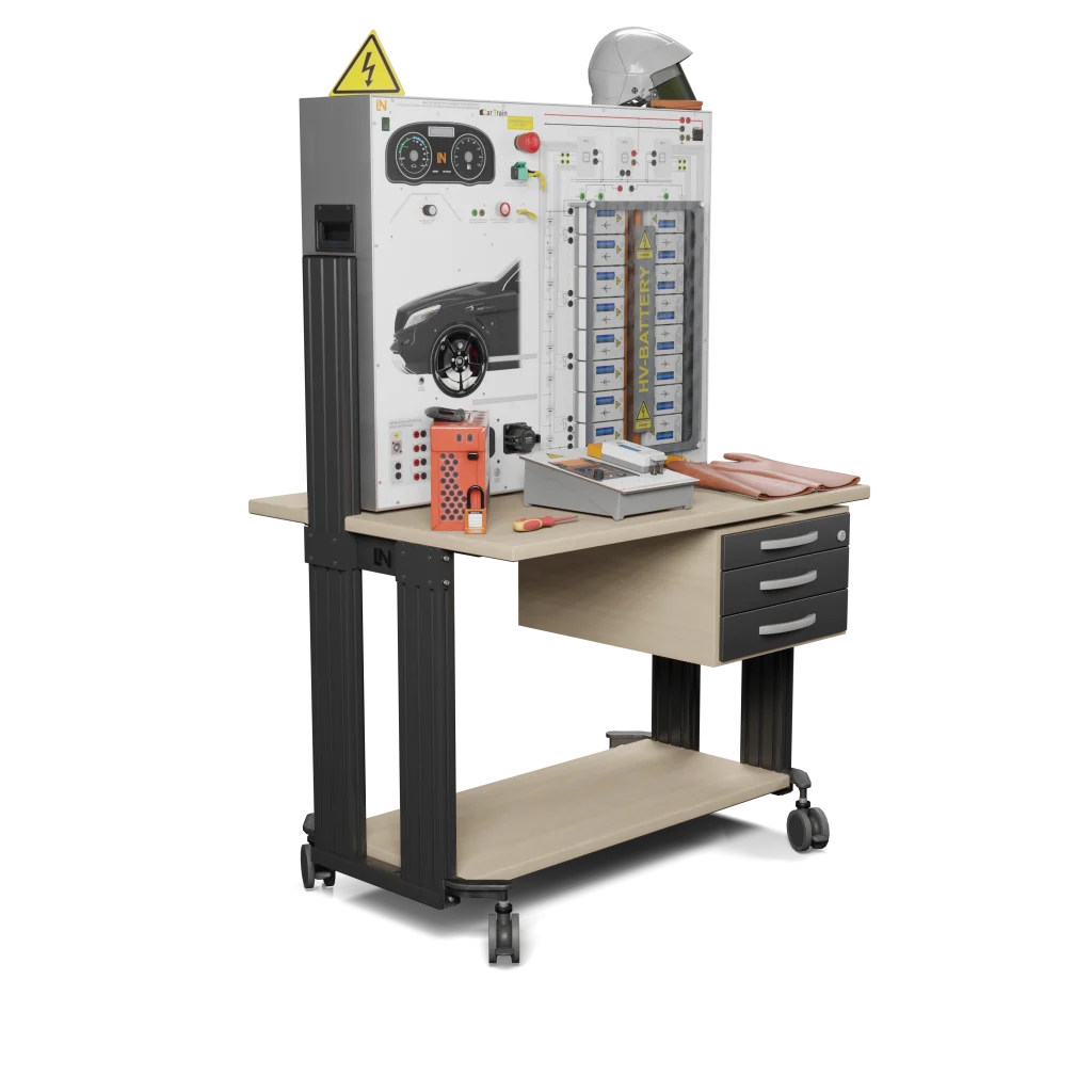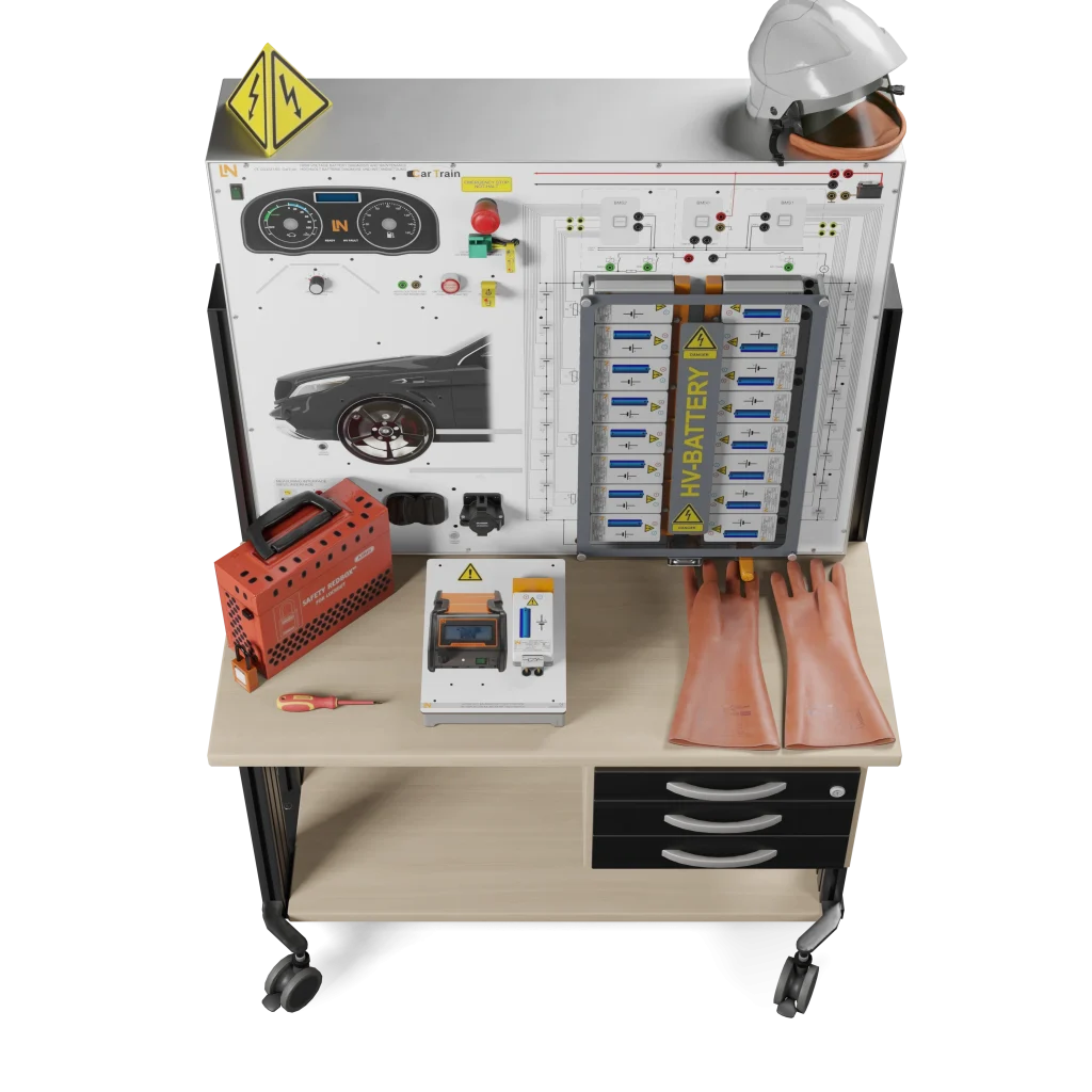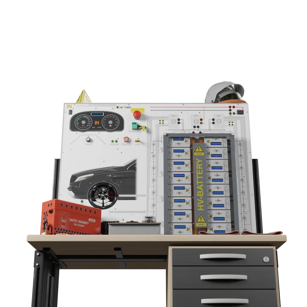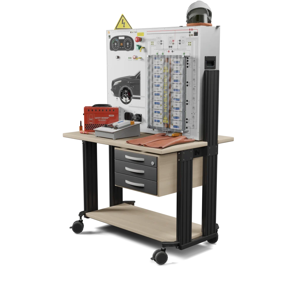Das modulare Trainingssystem bildet eine reale, zerlegbare Hochvolt-Batterie mit einem vernetzten Batteriemanagementsystem (BMS) nach. Eine integrierte Fehlerschaltung ermöglicht Ihnen praxisnahe Diagnosen. Sie erwerben praktische Handlungskompetenzen, um Fehler bis auf Zell- und Sensorebene sicher zu diagnostizieren und die Instandsetzung durchzuführen.