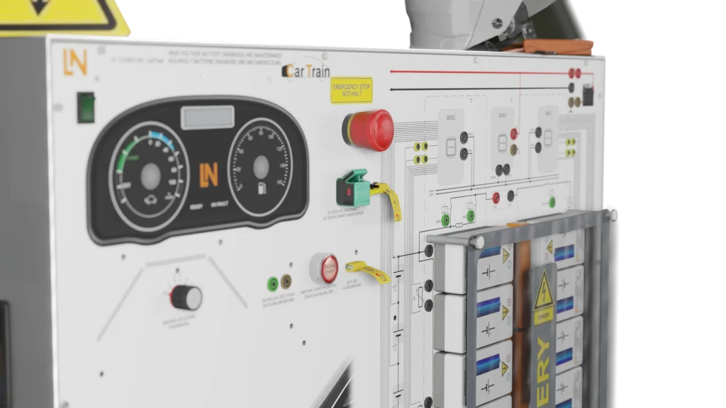 Das CarTrain-Tainingssystem bereitet Personen in der Qualifizierung optimal auf die systematische Fehlersuche und Reparatur in der automobilen Servicepraxis für Hochvolt-Systeme vor. Es unterstützt die Ausbildung zur Diagnose an vernetzten CAN-Bus-Systemen im Fahrzeug. Sie trainieren sicher und effizient, um die höchsten Anforderungen der DGUV 209-093 Stufe 3S zu erfüllen.