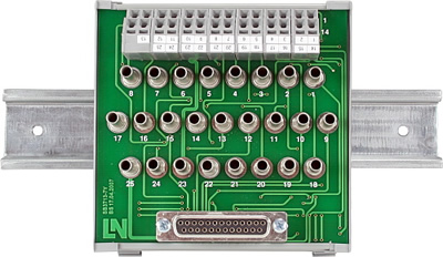 Universaladapter zum Verbinden von Experimentierstationen mit unterschiedlichen Anschlüssen. Mit Halterung zur Befestigung auf Hutschienen mit folgenden Anschlüssen: 25-poliger D-Sub Anschluss Klemmleiste 25-polig 25 Stück 4 mm Experimentierbuchsen