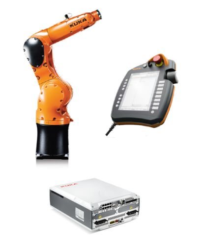 Der KR 6 R700-2 besitzt eine maximale Traglast von 6,8 kg und eine Reichweite von ca. 726 mm. Der KR Roboter ist konsequent auf besonders hohe Arbeitsgeschwindigkeiten ausgelegt. Traglast: 6,8 kg Max. Reichweite: 726 mm Max. Höhe: 1100,9 mm Anzahl der Achsen: 6 Wiederholgenauigkeit (ISO 9283): ±0,02 mm Gewicht: 50 kg Einbaulagen: Boden, Decke, Wand Schutzklasse: IP 54 Energiezuführung intern verlegt: 1 x Luft auf unten genanntes Ventil gelegt 1 x Vakuum 1 x Bus 1 x E/A Interne Ventile: 3 Stück 5/2 Wegeventil in der Roboterhand integriert zu Greiferansteuerung Die Robotermechanik wird in der Farbe R0000 KUKA Orange ausgeliefert. Steuerung KR C5 micro: Die KUKA Robotersteuerung KR C5 micro ist die neueste Technologie zur Ansteuerung der KUKA Kleinroboter. Mit seiner modernen Architektur und zahlreichen Innovationen setzen Sie auf die Zukunft der Steuerungstechnik. Neue Systemsoftware KSS 8.7 oder neuer Intuitive Kuka smartPAD Steuerung Global einsetzbar: Die KR C5 micro erfüllt alle weltweit relevanten ISO-Normen und versteht 25 Sprachen – auch die wichtigsten asiatischen. Schnittstellen: Ethernet- & EtherCAT-Ports 24 V Spannungseingang (externe Versorgung für E / A) 24 V Spannungsausgang (von externer Versorgung) 16 digitale Eingänge (npn / pnp) 16 digitale Ausgänge (npn / pnp) 3 Eingänge schnelles Messen 1 UL-Lampe 4 sichere Eingänge: NOT-HALT extern, Bedienerschutz, Quittierung Bedienerschutz, 1 reserviert Zustimmung extern 2 USB-Ports SSD-Slot Display-Port Technische Daten: Einspeisung: AC 200 V – 240 V; 50 Hz – 60 Hz Achsen: 6 Achsen / 3×12 A + 3×5 A CPU-Architektur: Intel X86 Interner Speicher: 60 Gbyte SSD Abmessungen (BxHxT): 300 mm x 134 mm x 392 mm (11.8 in x 5.27 in x 15.4 in) Gewicht: 9,8 Kg (21.6 lbs) Schutzklasse: IP 20 Umgebungstemperatur: 0 °C – 45 °C (32 °F – 113 °F) Sicherheit: ISO 10218-1 Industrieroboter ISO 13849-1 Kat. 3 / Performance Level d Zulassung: UL Mitgeliefertes Zubehör: Kuka smartPAD Externe Akkubox Steckerpaket Montagewinkel Zuleitung   Hinweis: Der Roboterarm darf erst in Betrieb genommen werden, wenn die Maschine, in die die unvollständige Maschine eingebaut werden soll, den Bestimmungen der Maschinenrichtlinie 2006/42/EG entspricht.