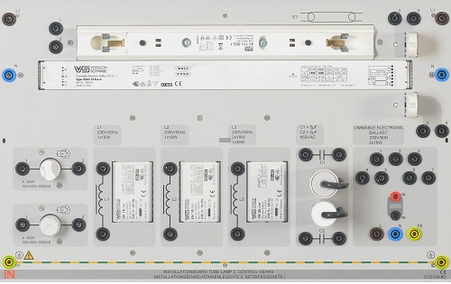 Dieses Installationsboard dient der Aufnahme und Verschaltung verschiedener Röhrenleuchten. Für den Betrieb der Leuchten sind sowohl konventionelle wie auch elektronische Vorschaltgeräte vorgesehen. Es werden unterschiedliche Schaltungsarten und das Dimmen von normalen Leuchtstofflampen und von LED-Röhren untersucht. Für den Einsatz im Beleuchtungsmanagement verfügt das elektronische Vorschaltgerät über einen DALI Busanschluss.