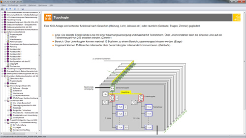Multimediale Experimentiersoftware mit virtuellen Instrumenten, Anleitungen und Dokumentation der Ergebnisse zum Thema „Aufbaukurs Gebäudeautomation mit KNX“:Interaktive VersuchsaufbautenFragen mit Feedback und Auswertelogik zur WissensstandkontrolleDruckdokument zum komfortablen Ausdruck der Versuchsanleitung mit LösungenVerfügbar in Deutsch, Englisch, Französisch, Spanisch, weitere Sprachen auf AnfrageLabsoft-Browser, Kurssoftware und Zusatzsoftware für externe MessgeräteDer Aufbaukurs SO2801-3L „Weiterführende Gebäudeautomation mit KNX“ vermittelt Ihnen, wie man komplette Steuerungen- und Regelungen aufbaut, wie man große Anlagen einrichtet, betreibt und verwaltet.Lerninhalte:Einrichten eines Touch-Displays als MeldezentraleSteuerung der Beleuchtung mit Präsenz- und HelligkeitssensorEinsatz einer WetterstationRegelung des Raumklimas mit Raumthermostat und Fan-Coil-AktorSchutz des Gebäudes durch den Einsatz eines SicherheitsterminalsNutzung von Logikfunktionen