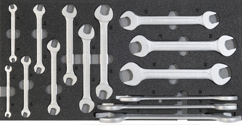 Schubladen-Werkzeugeinsatz Kfz-Technik 1 – Doppelmaulschlüssel-Satz, bestehend aus 14 Teilen in zweifarbiger Schaumeinlage (schwarz/grau) in den Maßen 300x600mm,