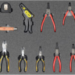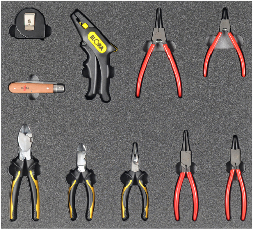 Schubladen-Werkzeugeinsatz Kfz-Technik 9 – VDE-Zangen-Satz, bestehend aus 10 Teilen in zweifarbiger (schwarz/grau) Schaumeinlage in den Maßen 500x450mm,