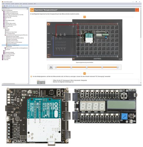 Lieferumfang: Adapterboard mit Arduino UNO shield Anwendungsboard mit Tastern, LEDs, LCD-Display, 7-Segment-Anzeige, Potentiometer, Lichtsensor und Audio-Ausgang für typische Microcontroller-Anwendungen   LabSoft Browser und Kurssoftware Flowcode Entwicklungsumgebung (IDE mit Editor, Compiler, Linker, Converter, Debugger, Loader) Aufbewahrungskoffer Lerninhalte: Erste Schritte bei der Programmierung eines Mikrocontrollers Programmierung im Flussdiagramm (Erweiterung mit C-Programmierung möglich) Programmierung typischer Mikrocontrollerapplikationen IO-Ports LED-Anzeige 7-Segement Anzeige Schalter und Taster LC-Display ADC/DAC Erstellen eines Flussdiagramms Parametrisieren einzelner Komponenten Compilieren und Debuggen von Programmen Laden des Programms in den Mikrocontroller