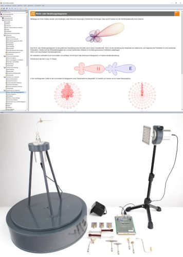 Lieferumfang: 1 Experimentierkarte X-Band-Antenneninterface, logarithmischer Detektor >60 dB Dynamikbereich, 16 Bit Messwertauflösung Schrittmotorgesteuerte Antennendrehplattform mit einer Auflösung von 0,1° Stativmaterial, Halterungen und Anschlusskabel Aluminiumkoffer zur Aufbewahrung Labsoft-Browser und Kurssoftware   Antennen Monopol, Dipole und Faltdipol 3-Element- und 6-Element-Yagi Helixantennen; rechts und links polarisiert Patchantennen; linear und zirkular polarisiert   Sender X-Band-Oszillator mit dielektrischem Resonator Festfrequenz 9,0 GHz (>-5 dBm), hochstabil und wartungsfrei Savety first – geringste Sendeleistung und Zuschaltung nur bei Messung optische Anzeige bei Abstrahlung   Empfänger X-Band-LNC exakte Messungen mit hoher Empfindlichkeit bis -65dBm Echtfrequenzmessung Lerninhalte: Einleitung zur Antennentechnik Antennenformen und Beispiele. Die Physik des Abstrahlens und des Empfangs Der Widerstand einer Antenne sowie dessen Anpassung und Symmetrierung (Balun) Die Abstrahlcharakteristik in Nahfeld und Fernfeld Der Antennengewinn Die Ausbildung des Richtdiagramms Messung von Richtdiagrammen verschiedener Antennen Kursdauer: ca. 8 h Zusätzliche Virtuelle Instrumente in LabSoft zu den Kursen „Antennentechnik“ und „Komplexe Antennensysteme“ Antennenkontrollcenter mit Pegelmesser (echte Messung) mit Echtfrequenzmessung der Trägerfrequenz Richtdiagrammplotter für Horizontal- und Vertikalebene 3D-Darstellung des Richtdiagramms sowie kartesische und polare Koordinatendarstellung Computergesteuerte Antennenpositionierung dB-Meter, 2-fach Zusätzliche Virtuelle Instrumente in LabSoft zu den Kursen Einführung in die Mikrowellentechnik und Hohlleiterbauelemente Mikrowellenkontrollcenter Stehwellendiagramm 2-Kanal-Oszilloskop mit erweitertem Messbereich und Auswertefunktion Spektrum-Analysator Gunn-Diodenkennlinienplotter Zusätzliche Virtuelle Instrumente in LabSoft zum Kurs Mikrostreifenleitungstechnik 2-Kanal-Oszilloskop mit erweitertem Messbereich und Auswertefunktion Bode-Diagramm Plotter für Frequenz und Phase (1 – 2 GHz) dB-Meter, 2-fach