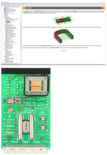 Lieferumfang: 1 Experimentierkarte mit 7 vorbereiteten Schaltungen Transformator mit abnehmbarem Eisenkern Kompassnadel zur Untersuchung von magnetischen Feldern Elektromagnetische Bauelemente: Reedschalter, Hallschalter und Relais Aufbewahrungskoffer Labsoft-Browser und Kurssoftware Lerninhalte: Erklären des Phänomens Magnetismus Kennen magnetischer Materialien Aufzählen von Beispielen für den Einsatz magnetischer Materialien in der Elektrotechnik Kennen und Erklären der Begriffe magnetische Pole, magnetisches Feld, Feldlinien und Feldstärke Untersuchung des Magnetfelds eines stromdurchflossenen Leiters Untersuchung des Magnetfelds einer Spule (Luftspule, Spule mit Kern) Kennen und erklären des Begriffs Elektromagnetische Induktion Untersuchung des Ein-, und Ausschaltverhaltens einer Induktivität Das Entstehen der Lorentzkraft erklären Aufbau und Funktionsweise eines Transformators erklären Untersuchung des Einflusses des Eisenkerns auf das Übertragungsverhalten eines Transformators Messtechnische Bestimmung des Übersetzungsverhältnisses eines Transformators Messtechnische Untersuchung eines Transformators bei verschiedenen Lasten Aufbau elektromagnetischer Bauelemente erklären: Relais, Reedschalter Experimenteller Nachweis der Funktionsweise von Relais und Reedschalter Experimentelle Untersuchung von Anwendungsschaltungen elektromagnetischer Bauelemente: Steuerschaltkreis mit Selbsthaltung, Hallsensor Kursdauer: ca. 4 h Zusätzliches Virtuelles Instrument in LabSoft für Kurs „Elektrotechnik 8 Messen mit dem Oszilloskop“ Phasengekoppelter 2-Kanal-Funktionsgenerator mit einstellbarer Phasenlage