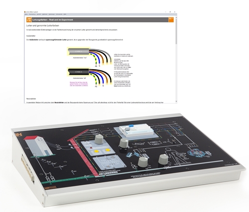 Lieferumfang: 1 Experimentierbord zum Aufbau verschiedener 3-phasiger Netzsysteme mit: 1 RCD, 4-polig, 30 mA 1 Trenntransformator 1 Transformator für Schutzkleinspannung 1 Isolationswächter, einstellbar 1 Modell Mensch 1 Erdersimulation 1 Verbraucher einphasig 1 Verbraucher dreiphasig 16 verschiedene Fehlersimulationswiderstände Satz Messleitungen und Brückenstecker LabSoft-Browser und Kurssoftware   Lerninhalte: Aufbau verschiedener Netzsysteme (TN, TT, IT) Schutz gegen direktes und bei indirektem Berühren Schutz durch Schutztrennung Schutz durch Schutzkleinspannung Überstromschutzeinrichtungen Fehlerstromschutzeinrichtungen Messungen und Überprüfungen von Schutzmaßnahmen Schutzleiterwiderstandsmessung Isolationswiderstandsmessung RCD-Test mit und ohne Auslösung Erdermessung Schleifenwiderstandsmessung Zeitdauer ca. 10 h  Zusätzliches virtuelles Instrument in LabSoft für Kurs „Gebäudesystemtechnik 2: Steuerungstechnik“ Schaltplan-Editor Zusätzliche virtuelle Instrumente in LabSoft für Kurs „Gebäudesystemtechnik 3: LED-Beleuchtung und Farberkennung“ Lux-Meter  Helligkeitssteuerung Farb-Scanner Farb-Mischer