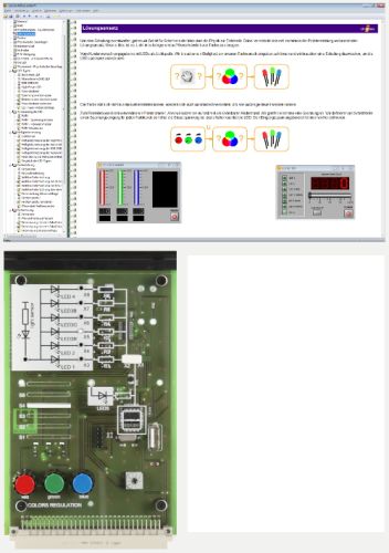 Lieferumfang Experimentierkarte LED-Beleuchtung mit: 4 unterschiedlichen LED-Typen, weiß und mehrfarbig 1 Universalhelligkeitssensor 3 LED’s RGB, einstellbar mit Potentiometern 1 programmierbare Hochleistungs-LED, RGB-LED Plexiglasabdeckung mit Reflexionsflächen Aufbewahrungskoffer Labsoft-Browser und Kurssoftware Lerninhalte Kennenlernen verschiedener LED-Typen Helligkeitsregelung verschiedener LED’s mit PWM Kennlinienaufnahme und Helligkeitsmessung Additive Farbmischung und Farbtemperatureinstellung Kursdauer: ca. 10 h Zusätzliches virtuelles Instrument in LabSoft für Kurs „Gebäudesystemtechnik 2: Steuerungstechnik“ Schaltplan-Editor Zusätzliche virtuelle Instrumente in LabSoft für Kurs „Gebäudesystemtechnik 3: LED-Beleuchtung und Farberkennung“ Lux-Meter  Helligkeitssteuerung Farb-Scanner Farb-Mischer