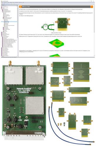 Lieferumfang: 1 Experimentierkarte Netzwerk-Analysator, Frequenzbereich 1 – 2 GHz, Empfindlichkeit -50 – 0 dBm, Ausgangsleistung 0 dBm, Frequenzauflösung 10 MHz Mikrostreifen-Bauelemente: 3 Mikrostreifenleitungen, Wilkinson-Teiler, 2 Tiefpassfilter (3.- und 5. Ordnung), Bandpass, Bandsperre (Butterfly-Element), FET- und MMIC-Verstärker, 2 Leitungsverzeigungen Messzubehör: SMA-Kabel, Dämpfungsglied und 2 Abschlusswiderstände Aufbewahrungskoffer LabSoft-Browser und Kurssoftware  Lerninhalte: Planare Mikrostreifenleitungen Berechnung der Leitungskenngrößen Untersuchung der Übertragungsfunktion Einfache Mikrowellenschaltungen Beschreibung mittels Streuparameter Streumatrix Untersuchung der Übertragungsfunktion des Wilkinson-Teilers und eines Richtkopplers Mikrostreifenleitungsfilter Filterentwurf Tiefpass 3.- und 5.Ordnung Bandpass (edge coupled filter) Bandsperre (butterfly element) Mikrowellenverstärker MMIC-Verstärker Rauscharmer FET-Verstärker Untersuchung der Reflexionen Bestimmung des Stehwellenverhältnisses Kursdauer: ca. 8 h.