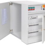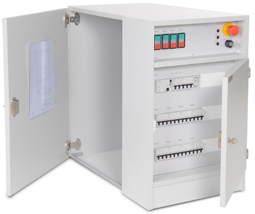Labor-Energieverteilung für 4 Gruppen + Lehrertisch besteht aus: 1 Lasttrennschalter 63A  1 Hauptschütz 63A 1 Not-Aus Pilztaster mit Rastung Not-Aus-Abschaltung via Trennerelement konform zur DIN VDE 0100-530 : 2011-06 1 Schlüssel Ein – Ausschalter 1 Steuersicherung 6A für den Steuerstromkreis 3 Außenleiterkontrollleuchten 5 Sicherungsautomaten 3 polig 16A 4 Ein Aus Taster mit Kontrollleuchte 4 Leistungsschütze Reihenklemmen zum Anschluss der Tische/Tischgruppen Lieferung ohne Unterschrank (zusätzlich ST8007-3X oder -3Y nötig) Diesem Verteiler ist eine tech. Sachverständigenprüfung mit Nachweis attestiert ???????Prüfgrundlagen: DIN VDE, VdS Klausel SK 3602, AFB, UVV, DGUV V3