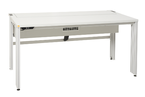 Hochwertiger Labortisch der SybaPro Reihe mit Aluprofil-Tischbeinen und integriertem, motorisch versenkbarem Energieversorgungskanal zur Aufnahme von 19“ 3 HE Einschüben und Einsatzplatten, kompatibel zu allen An- und Ausbauteilen des SybaPro Systems.