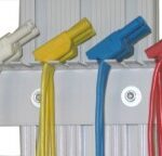 Messleitungshalter aus 1,5mm Stahlblech, passend zu allen Möbeln des SybaPro Aluprofil Systems, zur Aufnahme von 48x4mm-Sicherheitsmessleitungen