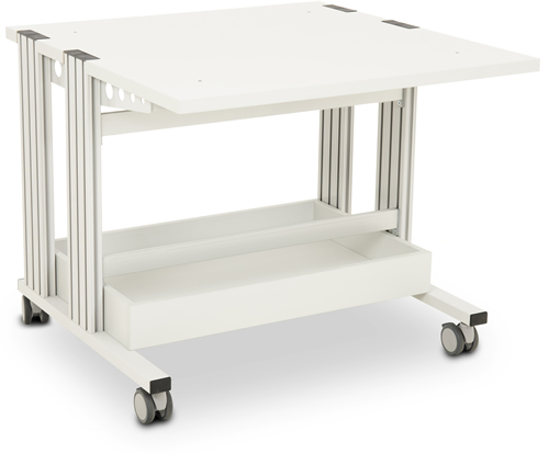 Hochwertiger, fahrbarer Experimentier- und Demostand der SybaPro Reihe mit Aluprofil-Tischbeinen und unterer Ablagebox.