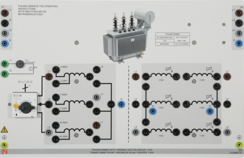 Mit dem Transformator mit variabler Schaltgruppe lassen sich alle Schaltungen von Ein- und Dreiphasentransformatoren aufbauen und untersuchen. Die Absicherung erfolgt mittels Motorschutzschalter und Temperaturüberwachung. Die folgenden Experimente können durchgeführt werden: Betrieb als 1 Phasen Transformator Bestimmen der Leerlaufspannung, Übersetzungsverhältnisse und Verluste Betrieb als Spartransformator Hoch oder herab transformieren Betrieb als Drehstromtransformator in verschiedenen Schaltungen Technische Daten: Eingangsspannung: 3x 230/400 V, 50/60 Hz Versorgung über Netzkabel Ausgangsspannung: 6x 115 V Leistung: 1000 VA Absicherung über Motorschutzschalter und separater Temperaturüberwachung Abmessungen: 297 x 456 x 130 mm (HxBxT) Gewicht: 15 kg