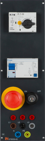Einschub zur Energieversorgung und Absicherung für Wechsel- und Gleichfehlerströme RCCB für SybaPro-Systemtische mit Dreieckprofilen als Energiekanal. Spannung 230/400V/50Hz Schlüsselschalter mit 2 Taststellungen für Funktionsfreigabe und Abschaltung Motorschutzschalter 10 … 16A Unterspannungsauslöser RCD Allstrom Fehlerstromschutzschalter Typ B gemäß VDE 0100, Teil 723 Not-Aus Drucktaster mit Drehentriegelung Not-Aus-Abschaltung via Trennerelement konform zur DIN VDE 0100-530 : 2011-06 5 Sicherheitsbuchsen L1, L2, L3, N, PE 3 Phasen-Kontrollleuchten Abmessungen: 2ME Gewicht: 1,8kg