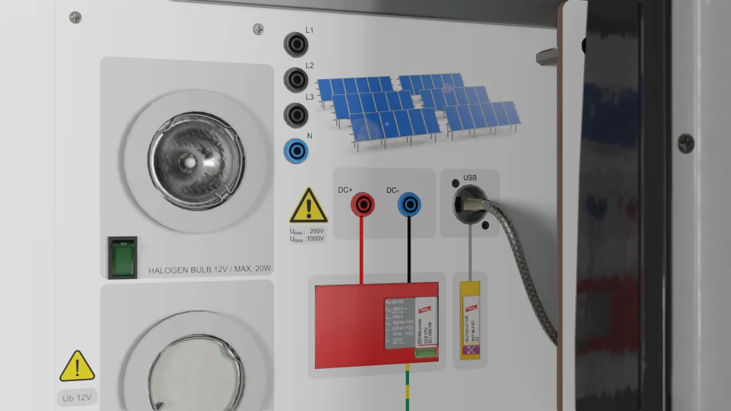 Die Solarmodul-Nachbildung mit drei unabhängigen Modulen liefert reproduzierbare Messergebnisse durch Entkopplung vom realen Sonnenlicht. Lernende untersuchen Bestrahlungsstärken, erstellen Verschaltungen, simulieren Teilverschattung und sie erproben die Schutzfunktion zuschaltbarer Bypass-Dioden.