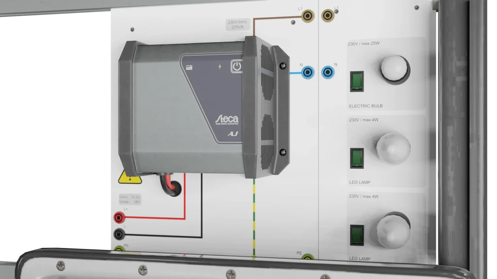Lernende analysieren den Insel-Wechselrichter, der 12V-Gleichspannung des Akkus in 230V-Wechselspannung für haushaltsübliche Verbraucher umwandelt. Sie prüfen die Sinus-Spannungsqualität und den Wirkungsgrad, um die Funktion und Umwandlungsverluste bei der Planung zu optimieren.