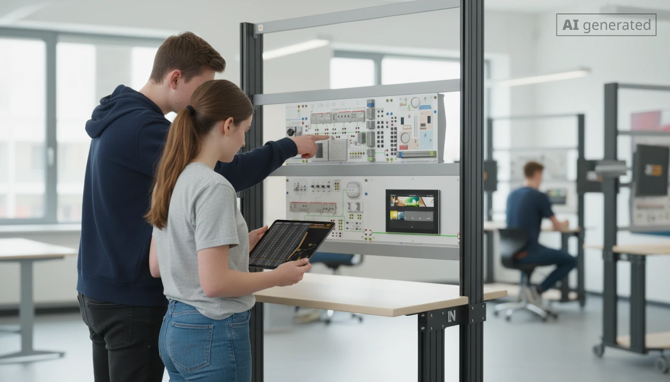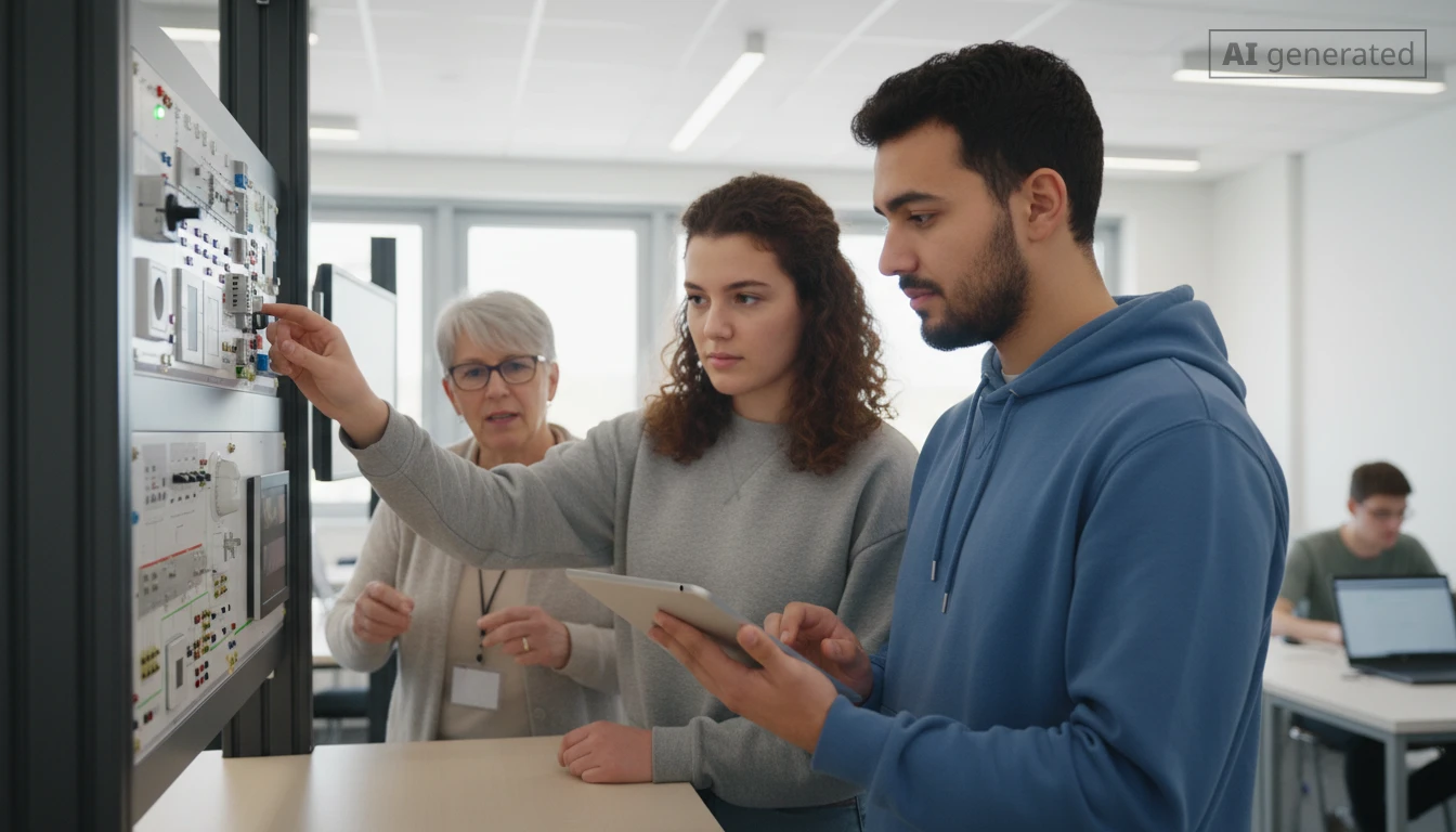 Lernende planen, verdrahten und nehmen eine Selbsthalteschaltung, eine Wendeschützschaltung und einen