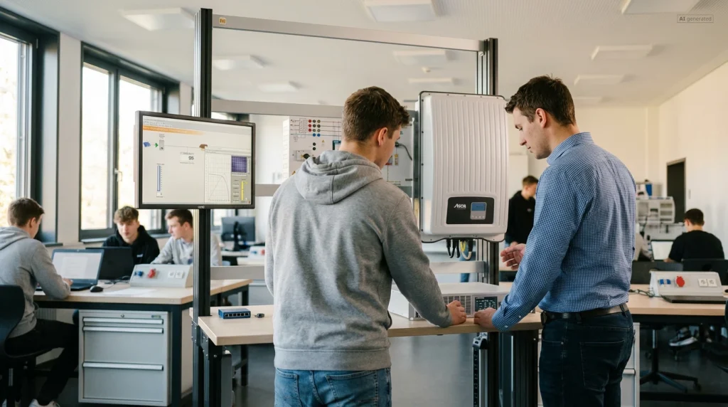 Durch die Emulation eines Solarfeldes und die Steuerung über eine SCADA-Oberfläche lernen die Teilnehmenden alle Aspekte von der Installation bis zum Monitoring. Dies gewährleistet eine umfassende Qualifizierung in der Planung, Installation, Inbetriebnahme und Wartung von netzgekoppelten PV-Anlagen.