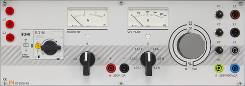 Ausgangsspannung: 3x 0…450V, 50/60Hz einstellbar über 3 Phasenstelltransformator (0,5 % Toleranz)