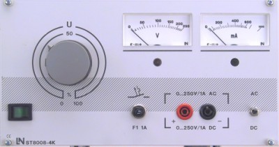 Einschub mit erdfreier Wechselspannung 0…250V/1A, umschaltbar auf Gleichspannung 0…250V/1A. 1 Spannungsmesser 0…250V 1 Strommesser 0…1A 1 thermisch-magnetischer Geräteschutzschalter 2 Sicherheitsbuchsen 1 Umschalter Wechsel- Gleichspannung Ausgangsstrom: 1A Netzanschluss: 230V, 50Hz Abmessungen: 3HE/48TE Gewicht: 6,2kg