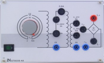 Einschub regelbare Spannungsversorgung AC/DC mit stufenlos einstellbarer Wechselspannung über Dreh-Stelltransformator mit nachgeschaltetem Sicherheitstransformator und frei zuschaltbarem Brückengleichrichter Netzanschluss: 230V, 50Hz Ausgänge: 0…14V / 12A, 0…27V / 6A 0…250V / 2A Ausgänge 4mm Sicherheitsbuchsen Absicherung: 2 Feinsicherungen 0,8/2A Abmessungen: 3HE/42TE Gewicht: 6kg