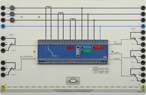 Lehrplatte mit digitalem Überlast- und Kurzschlussschutz für elektrische Maschinen und Leitungen in vermaschten Netzen (ANSI 50/ 51 und 67). Die Parametrierung des Relais kann wahlweise von Hand oder mit einem PC über die integrierte RS485 Schnittstelle erfolgen.
