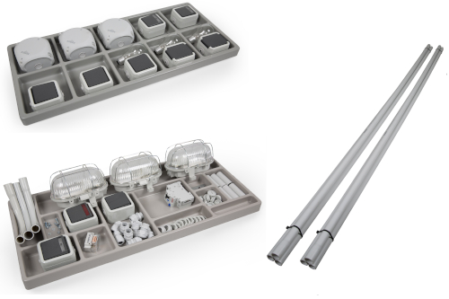 Mit dem handelsüblichen Installationsmaterial werden Lampenschaltungen der Gebäudeinstallation realisiert. Je nach verwendetem Verdrahtungsmaterial werden verschiedene Installationsarten umgesetzt. Die Schaltungen werden komplett von der Einspeisung bis zum Verbraucher aufgebaut. Alle Installationsgeräte sind für Netzspannung zugelassen und entsprechen den DIN – Normen. Netzspannung: 230 V Installationsart: Aufputz, Feuchtraum Lieferumfang: 1 Sicherungsautomat 2 A 1 Ausschalter mit Kontrolllampe 2 Wechselschalter 1 Serienschalter 1 Kreuzschalter 3 Taster 2 Schukosteckdosen 2 PVC-Verbindungsstücke für Schalter 3 Abzweigkästen 3 Ovalleuchten, SK II, LED 1 Stromstoßschalter 1S9; 230 V 1 Treppenhauslichtautomat 10 Verschraubungen PG 16 13 Blindstopfen PG 16 3m ISO-S Rohr PG11, geschnitten 3 ISO-S Bogen PG11 mit Muffe Modulmulden zur Aufbewahrung aller Teile Gewicht: 3,5k g
