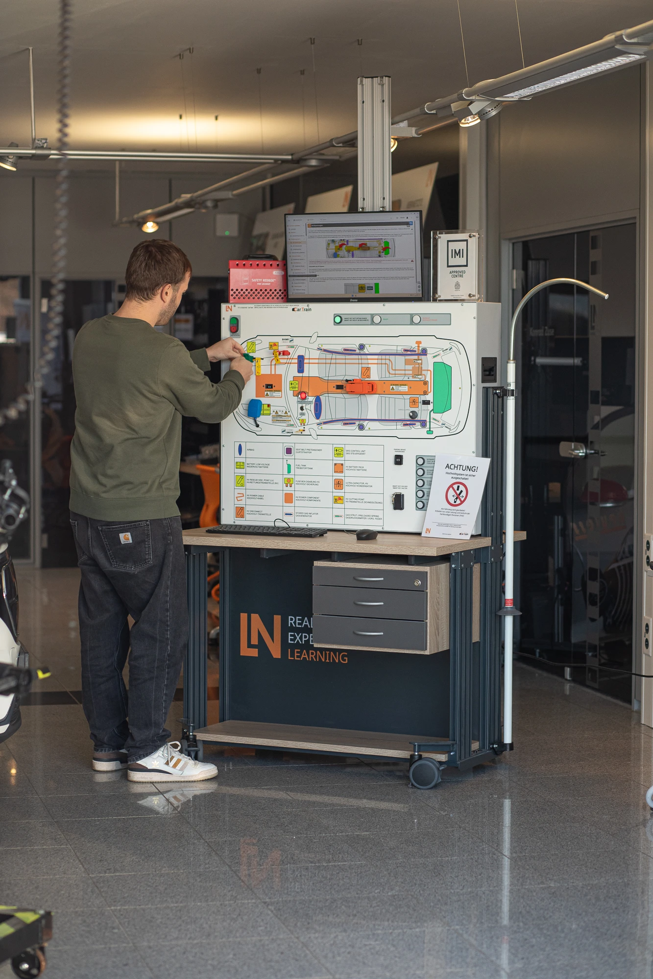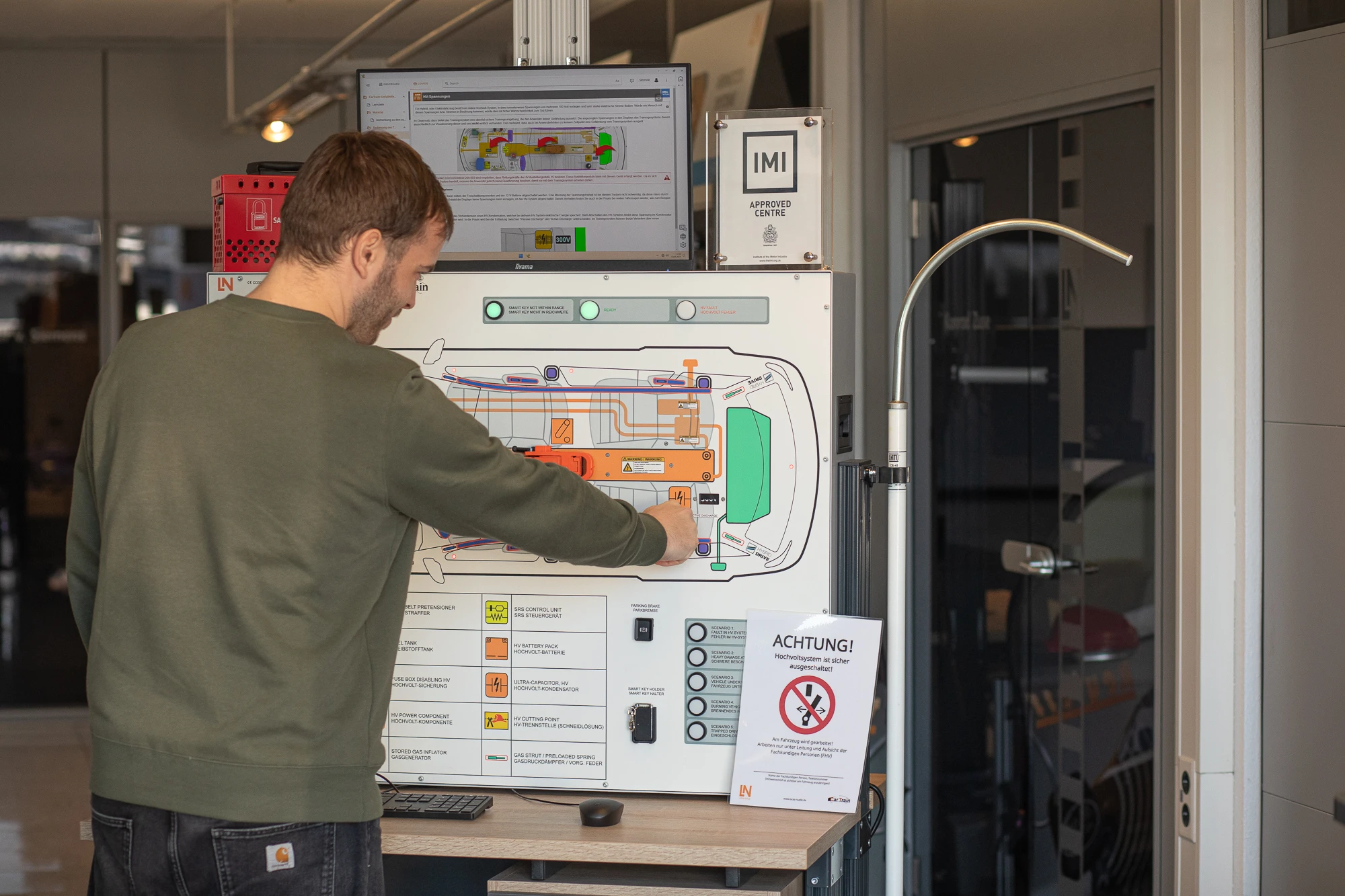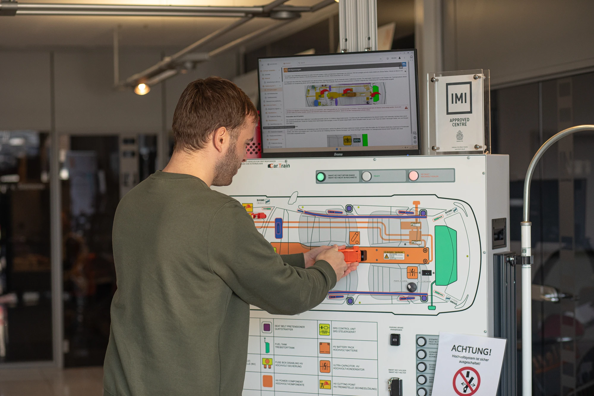 Anhand realistischer, schaltbarer Unfallszenarien erlernen Einsatz- und Rettungskräfte das korrekte Vorgehen. Das System vermittelt gezielt die notwendigen Kompetenzen, um Hochvolt-Gefahren am Unfallort sicher zu erkennen, das Fahrzeug zu deaktivieren und die Rettung korrekt durchzuführen.