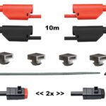 Satz Sicherheitsmessleitungen inkl. 4mm-Sicherheits-Schnelldruckklemmen und Befestigungsset für die vordere und hintere Nut von SybaPro Aluprofilen. Set bestehend aus: 4 Sicherheitsmessleitungen mit stapelbaren 4 mm Lamellen- Steckern und hochflexibler, doppelt isolierter Leitung 2 Sicherheitsmessleitungen 10m lang, schwarz 2 Sicherheitsmessleitungen 10m lang, rot Leitungsquerschnitt 2,5 mm2 Bemessungsdaten: 600V CAT II, 32A 4 Kabelbinderblöcke zum werkzeuglosen Eindrehen in die vordere und/oder hintere Nut des SybaPro Aluprofils 4 Kabelbinder 2 x 4mm-Sicherheits-Schnelldruckklemme „schwarz“ 2 x 4mm-Sicherheits-Schnelldruckklemme „rot“