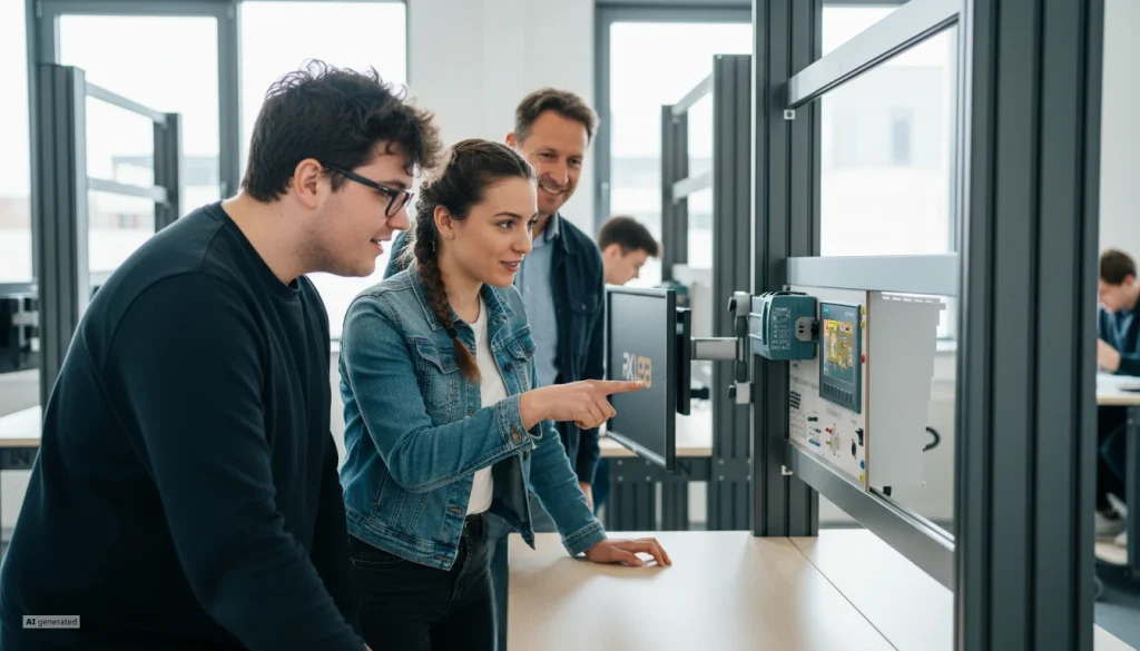 Der SPS-Trainer (SIMATIC S7-1215C + KTP700) ist ein komplettes Ausbildungssystem in Pultbauweise. Neben SPS und HMI sind vielfältige integrierte Bedienelemente (Taster, Rastschalter, Potentiometer) zur Simulation digitaler und analoger Eingangssignale vorhanden. Dies ermöglicht realitätsnahe Interaktion ohne externe Hardware und vereinfacht die Experimentvorbereitung erheblich.