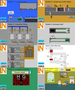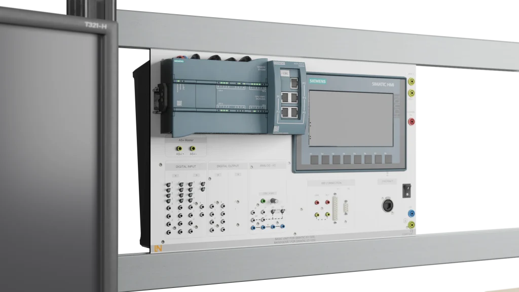 Lehren Sie die SPS-Programmierung praxisnah mit acht virtuellen Anlagenmodellen auf einem Siemens-HMI-Touchpanel. Eine reale Siemens-S7-1200-SPS steuert diese für vielfältige Aufgaben.