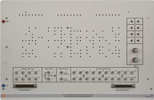 Der Universal-Anlagensimulator bietet die Möglichkeit, in Verbindung mit einer beliebigen SPS oder LOGO verschiedene Anlagen und Schaltungen (analog/digital) mit geringem Installationsaufwand praxisnah zu realisieren. Die Versuche sind lehrplanorientiert ausgearbeitet. Der Anlagensimulator ist mit Schaltern und Tastern als Sensoren sowie LEDs und einer elektronischen Schaltung zur Nachbildung der Aktoren ausgestattet. Prozessrückmeldung (z.B. eine Schützrückmeldung) werden automatisch generiert. Zur Nachbildung von Bewegungen, Pegeln und Positionen sind 3 Lauflichter im Gerät integriert. Die einzelnen Versuche werden durch Auflegen der bedruckten Masken realisiert.