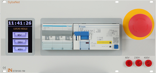 19″ SybaNet-Netzfeld 4.0, 400 V/50 Hz, 3 Schaltebenen, FI Typ B, Leitungsschutzschalter 3-pol., Not-AUS Fernsteuerbares 3HE (19″) Kanal-Einschubnetzfeld (Drehstrom) inkl. 2,8 Zoll Touch-Display, zur Energieversorgung und Absicherung Sicheres Freischalten von bis zu 3 Spannungsebenen (z. B. Schutzklein-, Wechsel- und Drehspannung) Die komplette Steuerung erfolgt über Ethernet. Individuelles/einzelnes, gruppenweises oder komplettes Steuern der Spannungsebenen. Zeitlich begrenztes Einschalten von Spannungen via Timer-Funktion Ein einfaches und intuitives Steuern der gesamten Funktionalitäten ist ohne zusätzlichen PC, dank eines im Gerät befindlichen Prozessors via Touchscreen möglich. Inkl. Absicherungs- und Schalteinheit für Drehstrom Allstromsensitiver Fehlerstromschutzschalter Typ B gemäß VDE 0100, Teil 723 Leitungsschutzschalter 3 polig 16 A Not-Aus-Schalter mit Rastung und gelbem Signalring  Die Not-Aus-Abschaltung muss via Trennerelement und konform zur DIN VDE 0100-530 : 2011-06 erfolgen. Not?Aus Fangschaltung mit Erkennung des Auslösers des „Not?Aus“ am Lehrer?Arbeitsplatz inkl. redundanter Rücksetzung zusätzlich über den Master-PC Platzgenaues Erkennen von ausgelösten Sicherungselementen (wie z. B. FI, Motorschutzschalter, LS) am Lehrer?Arbeitsplatz inkl. redundanter Rücksetzung zusätzlich über den Master-PC Alle Schaltzustände (Not-Aus, FI ausgelöst, Spannungen an/aus, etc.) werden am Display und parallel zum Master-PC übertragen Mindestens 3 zur SW zusätzliche HW-Kontrollleuchten zur Visualisierung der zugeschalteten Spannungsebenen Es müssen mindestens 3 Steuerschütze, 3 Leistungsschütze, 2 Überwachungsschütze sowie weitere HW-Einrichtung zur unabdingbar geforderten Überspannungs- und Kurzschlussfestigkeit des Systems vorhanden sein. Ebenso müssen HW und SW-Maßnahmen vorhanden sein um Einschaltstromspitzen zu erkenn und abzufangen. Die Relais- und Umschaltkontakte müssen somit vor Abriss und Verkleben gesichert sein. 6 via Ethernet fernsteuerbare digitale Ausgänge für z. B. Versenktischsteuerung 2,8″ TFT-Touch-Display zur Anzeige und Zuschaltung der freigeschalteten Parameter sowie der Anzeige folgender Features: Uhrzeit, Timer, NOT-AUS, FI- und LS-Auslösedetektion, Überlast/Kurzschluss; inkl. automatischem Bildschirmschoner Definierte Signale und Spannungen verschiedener Endgeräte (z.B. Labornetzgeräte, Generatoren) können ferngesteuert werden. Die Geräte können zusätzlich für eine Einstellung durch den Schüler gesperrt werden Zusätzlich erforderlich: Bedienung erfolgt über die SybaNet-Labormanager SW mit externem Lehrer-PC oder über die SybaNet-Control Unit/ 19″ Touch Panel PC (Master-PC). Zum Betrieb der einzelnen Clientplätze ist kein separater/externer PC an den Schülerplätzen nötig Weiterhin ist optional eine zusätzliche parallele oder einzelne Steuerung mit möglicher Sperrung des 2. Gerätes über ein mobiles Tablet oder einen 2. PC möglich. Abmessungen: 3 HE/54 TE Gewicht: 2,3kg