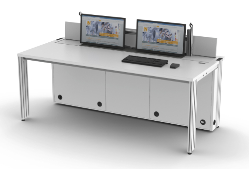 SybaPro Alu-Labortisch mit el. versenkbarerem Doppelmonitorhalter.