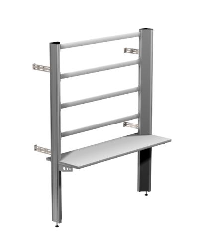Hochwertiger Steh-/Wandarbeitsplatz mit SybaPro Energiekanal-Aluminiumprofilsäulen in Dreieckform. Der Arbeitsplatz verfügt über Wechselrahmenprofile als 3-etagiger Experimentierrahmen zur Aufnahme diverser tech. Lehrgeräte. Die Aluminiumprofilsäulen in Dreieckform als Energiekanal sind zusätzlich zur Aufnahme verschiedener Energieversorgungsgeräte vorgesehen. Der Arbeitsplatz ist kompatibel mit allen An- und Ausbauteilen des SybaPro Systems und kann somit vielseitig ausgestattet und erweitert werden. Durch die kombinierten System-Energiekanäle der SybaPro Serie ist die zusätzliche SybaPower-Medienversorgung sowie Mess-, Test- und Ausgabegeräte integrierbar. In den äußeren Profilnuten sind zudem Anbauteile wie z. B. PC- und Monitorhalter anbaubar. Tischplatte: 30mm-Tischplatte aus hochverdichteter, mehrschichtiger Feinspanplatte nach DIN EN 438-1, Farbe grau, RAL7035 Tischplattentiefe 400mm Beidseitig 0,8mm leichtstrukturierter Schichtstoffbelag (HPL) nach DIN 16926 Beständig gegen eine Vielzahl von Chemikalien und Reagenzien, wie verdünnte Säure und Laugen Hitzeunempfindlich, z.B. gegen flüssiges Lötzinn sowie punktförmigen Erwärmungen von Lötkolben oder Zigarettenglut Einfassung der Tischplatte mit massiver, schlagzäher Schutzkante aus 3mm dickem, durchgefärbtem ABS-Kunststoff der Farbe RAL7047 Tischplattenbelag und ABS-Schutzkante sind PVC frei Die Tischplatte ist stufenlos höhenverstellbar Gestell und Säulen: Seitenteile aus Aluminium-Profilsäulen in Dreieckform als Energiekanal  Pulverbeschichtet, Standardfarbe: grau (RAL7047), weitere Farben möglich Zur Aufnahme diverser Geräte zur Energieversorgung und Absicherung (kein zusätzlicher Energiekanal nötig) 6 gleichwertige Nuten im Alu-Strangpressprofil (2 je Seite + 1 je Kopfseite) Nuten zur Aufnahme von industriegenormten Halterungen Bestückung je Seite mit maximal 11x 1-ME-Modulen (div. Medienversorgung) ober (7ME)- und unterhalb (4ME) der Tischplatte Vorverdrahtet mit Stromversorgungsbussystem für spezielle ME-Einschübe oder Einsatzplatten Reihenklemmen für den bauseitigen Anschluss Hochstrom-Schnellsteckverbindungen der Schutzart IP20 nach DIN EN 61984:2009 zusätzlich Leitungsführung innerhalb des Energiekanals möglich Je Säule mit integriertem Niveauausgleich (Stellbereich 0-40mm) Optional mit 400mm langen Bodenausleger/Standfüßen mit 2-fachem Niveauausgleich (Stellbereich 0-40mm) Ausleger/Füße mit je 2 Bohrungen zur Bodenmontage, wodurch der Arbeitsplatz auch frei im Raum stehen kann (zusätzliche Versteifung bis zur Raumdecke empfohlen) Mit den zusätzlichen Standfüßen/Bodenauslegern erhöht sich die Gesamthöhe um mindestens 30mm (1975mm >> 2005mm + optional 0-40mm möglicher Verstellbereich Niveauausgleich) Stufenlos höhenverstellbare Tischzarge aus stabiler, umlaufender Stahl-Rechteckrohrkombination mindestens ST37 mit zusätzlicher mittlerer Querstrebe zur Stabilitätserhöhung Säurebeständig Epoxidharzbeschichtet (ca. 80µm), Farbe grau RAL7047 Wechselrahmenprofile /Experimentierrahmen: 3-zeilige Aufnahmemöglichkeit von Experimentierboards im DIN A4-Format = Höhe: 297mm Naturgebürstete/eloxierte Aluminiumprofilschienen zur Aufnahme von Experimentierboards Innenliegende Bürstenleisten garantieren festen Sitz und vermeiden Vibrationsgeräusche Inklusive sämtl. Befestigungsmaterial Variable Wandbefestigung: Inkl. 4x einstellbare Befestigungswinkel, stufenlos im gesamten Profilbereich montierbar Tiefen-Verstellbereich: 170mm, somit einstellbarer Wandabstand von 155 – 325mm Abmessungen: Tischplattenhöhe (Standardeinstellung) 760mm Maße 2000x1975x400mm (nur Arbeitsplatz [B x H x T]) Gesamttiefe inkl. Befestigungswinkel = 555 – 725mm