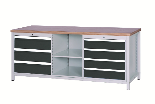 SybaWork-Werkbank mit zwei Unterschränken (3 + 4 Schubladen) und 2 Fachböden