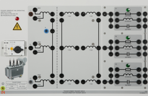 Mit dem Transformatortrainer lassen sich alle Schaltungen von Ein- und Dreiphasentransformatoren aufbauen und untersuchen. Die Platte besteht aus einem speziellen Transformator und einer darauf abgestimmten RLC-Last. Die Absicherung erfolgt mittels Motorschutzschalter und Temperaturüberwachung.